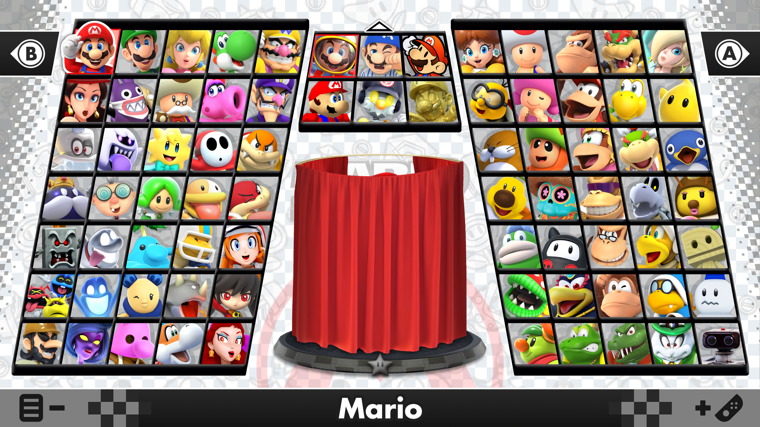 I wanted this roster design to feel authentic, as though it actually came from an official game. The mock-ups display different variants of the same menu; some with hidden characters, and others including everything unlocked. The drop-down menu in the center of the screen is for alternate character costumes, where a dynamic curtain will drop over the player as they change.